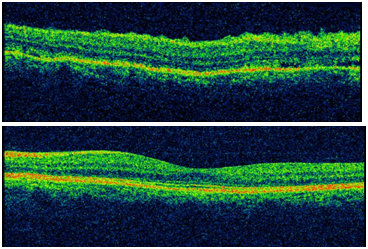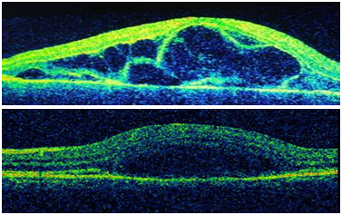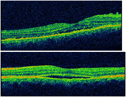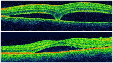 Figure 2E & 2F, OCTs showing macular detachment in both eyes. Notice that in the right eye the detachment is severely tabicated.