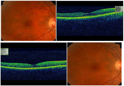 Biochemistry, microbiology and autoimmunity parameters were normal. HLA-DR4 was positive. The patient was treated with oral steroids prednisone 60 mg every 24 hours and omeprazole, 20 mg c/24h. A week later, the VA's OI has improved to 20/30 and the exploration of the fundus and the OCT showed a decrease macular neurosensory detachment striking her left eye. After a month of treatment, VA was 1 in both eyes and the fundus and OCT scan were normal (Figure 2G&2H).