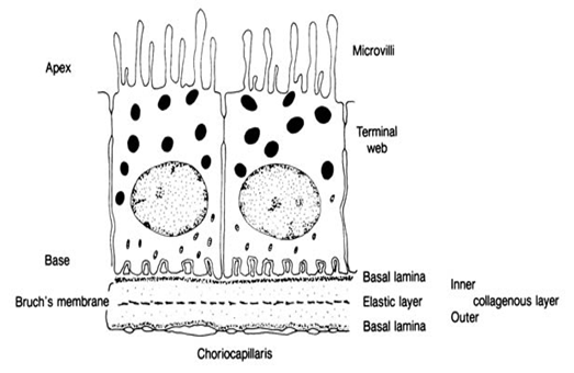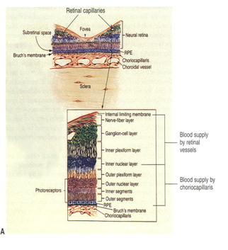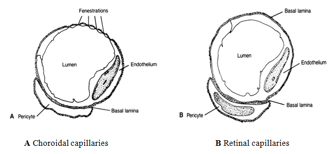 Mainly from posterior ciliary arteries. The ocular fundus has two separate vascular systems-retinal and choroidal-separated by a specialized pigmented monolayer the retinal pigment epithelium (RPE) (Figure 3) (Figure 4). The choroid and it’s vasculature lie posterior to the RPE, the fluorescein angiographic patterns of the posterior uvea are, therefore, always partially obscured by the RPE.2 The degree of pigmentation and the pathologic changes in this pigmented layer markedly influence the choroidal angiographic appearance there is two barriers in the retina: 1. Outer retinal barrier: consists of tight junctions between the retinal pigment epithelium (RPE) 2. Inner retinal barrier: consists of non-fenestrated capillaries of retinal circulation (Figure 5). These barriers called the blood-retina barrier (BRB). It’s main function is control and prevents entry of certain substance to the tissue of the retina.