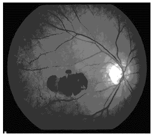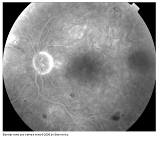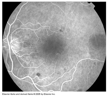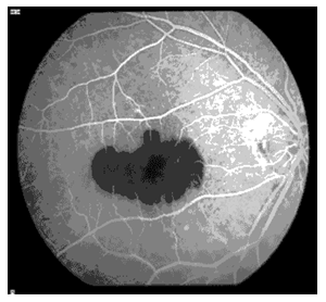 Choroidal phase: (Figure 6) begins 10 to 12 seconds after dye injection in young and 12 to 15 seconds after injection in older patients, early choroidal fluorescence is faint patchy and irregular called the choroidal flush. Areas of choroidal filling and non-filling become more distinct called patchy choroidal filling.