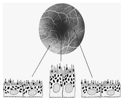 Figure 3 The ocular fundus has two separate vascular systems-retinal and choroidal-separated by a specialized pigmented monolayer the retinal pigment epithelium.
