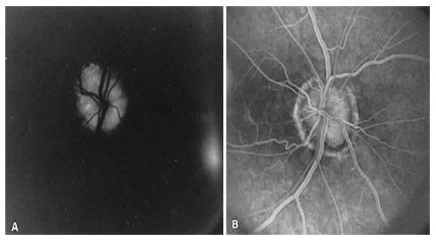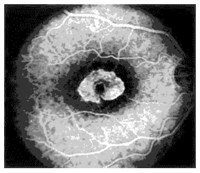 Is mainly divided into 1) blocked fluorescence and 2) vascular filling defect. Blocked fluorescence: Blocked fluorescence when stimulation or visualization fluorescein blocked by Blood. (Figure 12) (Figure 13) Pigment (Figure 14) Fibrosis vascular filling defect: (Figure 15) Vascular filling defect: Occurs when the retinal or choroidal vessels do not fill properly as in non-perfusion of artery vein. Capillary hyper fluorescence is mainly divided into 1) Autofluorescence 2) Transmission defect (window defect) 3) Leaking 4) Pooling and 5) Staining. Auto fluorescence: (Figure 16) compounds absorb blue light and emit yellow-green light in a similar fashion to fluorescein. It is imaged much more effectively by scanning laser ophthalmoscopy but can also be detected on standard fundus photography in exposed optic nerve head drusen and sometimes with Lipofuscin in retinal drusen and other abnormalities such as astrocytic hamartoma and angioid streaks. Transmission defect (window defect): (Figure 17) A window defect refers to the choroidal fluorescence produced by a relative decrease or absence of pigment in the RPE or an absence of RPE. The hyper fluorescence occurs early and reaches its greatest intensity with the peak of choroidal filling leaking: (Figure 18) Leakage of fluorescein dye is defined as hyper fluorescence of fluorescein in the extra vascular space. Typically the area of fluorescence increases in both size and intensity as the study progresses.