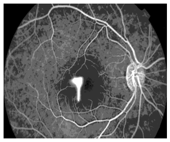 Arteriovenous phase: (Figure 9) The dye completely fills the lumen of the vein. Perifoveal capillary network is best visualized at 20 to 25 seconds after the injection of the dye when the concentration of the dye is maximum The fovea appears hypo fluorescent because of the absence of the blood vessels in the foveal avascular zone (FAZ) and due to the blockage of the background choroidal fluorescence by the increased pigment in the tall RPE cells at the fovea (Figure 10).