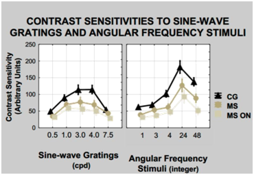 Results for the angular frequency stimuli showed differences at all frequencies 1, 3, 4, 24, and 48 cycles/360º, for the CG, MS and MSON (p<0.0001). In the interaction MS versus MSON, there were differences in the frequencies of 1, 3, and 48 cycles/360º for the right eye, and at all frequencies of 1, 3, 4, 24, and 48 cycles/360º, for the left eye. The frequency of 24 cycles/360º is the one that best differentiated the groups surveyed. On the other hand, the results of CS with sine-wave gratings show differences at all tested frequencies 0.5, 1.0, 3.0, 4.0 and 7.5 cpd, when MSON and CG were compared, and also when MS and MSON were compared (p <0.0001). Comparing MS and CG yielded differences spatial frequencies of 0.5, 3.0, 4.0 and 7.5 cpd for the right eye (p < 0.0001), and of 0.5, 1.0, 3.0 and 4.0 cpd, for the left eye (p < 0.0001). The spatial frequency of 3.0 cpd was found to be of maximum of sensitivity for the groups with MS and MSON, and declines at 4.0 cpd, as compared to the CG (Figure 1). The spatial frequency of 4.0 cpd was the one that best differentiated the three groups surveyed.