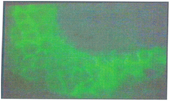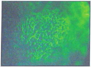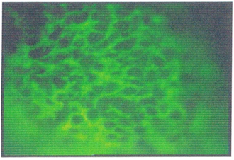 Figure 1 Human leukocyte antigen–antigen D related (HLA-DR) antigen expression using fluorescein isothiocyanate (FITC)-stained monoclonal antibodies in deeper tissues of a conjunctival biopsy of a 17 -year-old trachoma patient in the inflammation stage of the disease (×l00).