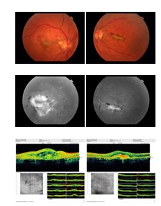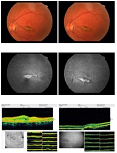 Initial mean central retinal thickness was 477.3 μ (range 776-363 μ) and decreased to 277.5 μ (range 223 – 467 μ) at the last visits. Mean central retinal thickness reduction was 199.8 μ (range 84-541 μ). Complete resolution of intra and/or subretinal fluid on OCT occurred in four eyes (66.8%). In two eyes which two injections were performed (33.2%), intra and/or subretinal decreased but never completely disappeared. Angiographic leakage was completely resolved in six eyes (100%) (Figure 2). No ocular or systemic complications such as endophthalmitis, retinal tear, retinal detachment, uveitis, myocardial infarction or cerebrovascular accidents were noted. Data of the patients are shown in Table 1.