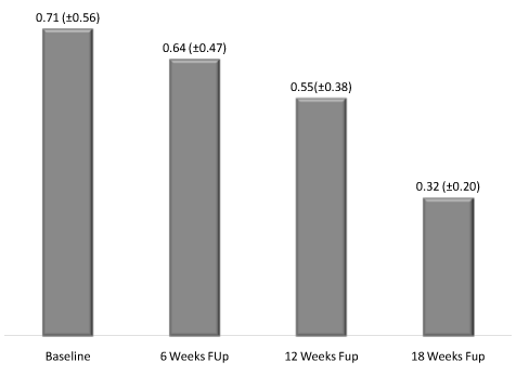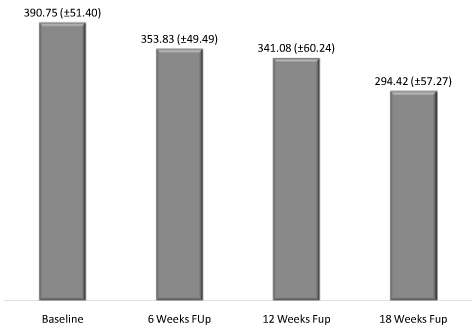 At baseline assessment, OCT was 390.75 (±51.40). The mean OCT at 4 weeks was significantly reduced to 353.83 (±49.49), (p=0.019). Furthermore, at the 8 weeks follow up assessment, the mean OCT continued its significant trend of improvement to reach 341.08 (±60.24), (p=0.016) and 294.42 (±57.27) in the 8 and 12 weeks follow up assessments respectively (Figure 2).