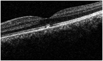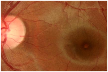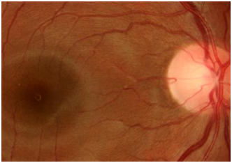 17 years old male with no past medical or ophthalmic history. He had exposed to laser pointer by friend for a few seconds at close distance, subsequently he noticed a decreased vision in following weeks with central scotoma. Power of laser unknown in mW. No history of refractive error or contact lens wear was noted.