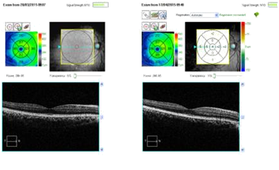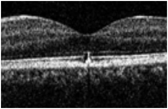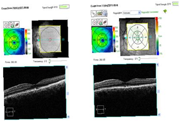 Fundus examination revealed retinal pigment epithelial changes on the fovea confirmed by OCT scan which is corresponding with the central scotoma on Amsler grid monitoring. Follow-up examinations revealed reduction in the area of RPE (retinal pigment epithelial hypertrophy) with no or little improvement of visual acuity measured by standardized Snellen or log MAR equivalent. There was no improvement in the area of central scotoma. The mystery remained on the power or class of laser pointer used. The RPE hypertrophy did not warrant any treatment as there was minimal evidence of inflammation and or fluid on the OCT scan. The RPE changes explained the area of scotoma and resolution in the thickness mapping of the subfoveal changes. After follow up of three months the patient who was a Turkish immigrant was lost to follow up (Figure 1–4).