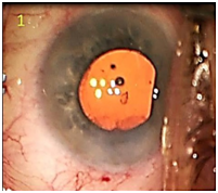 Figure 1 Microscopic view of lens fragment anterior to posterior chamber intraocular lens in the capsular bag.