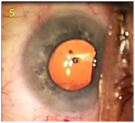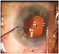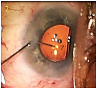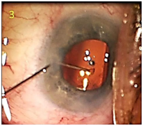 A 23 gauge-cannula on a 3ml syringe filled with balanced saline was placed through the side port incision (Figure 2). Minimal irrigation was used to maintain the anterior chamber depth. The cannula tip was advanced toward the lenticular fragment and secured to the tip by gentle aspiration (Figure 3). Once the fragment was secured, slightly more aggressive irrigation was used to draw the material into the cannula (Figure 4). No flattening or fluctuation of the depth of the anterior chamber was observed. The cannula was then removed from the eye and the anterior chamber was observed to be free of any residual material (Figure 5). The patient’s post-operative course was unremarkable with normal intraocular pressure, clear cornea, and quiet anterior chamber by 2 weeks after surgery with all drops tapered off by 3 weeks post-operatively with best corrected vision of 20/25 OS. The fundus showed no abnormalities other than retinal pigment epithelium changes that were present prior to the cataract surgery.