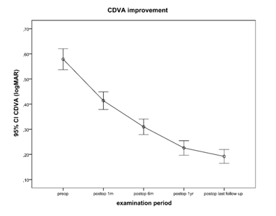 Figure 1 CDVA improvement after PPV, measured at preoperative and at each postoperative time visit. Error bars represent the 95% Confidence Interval (CI).