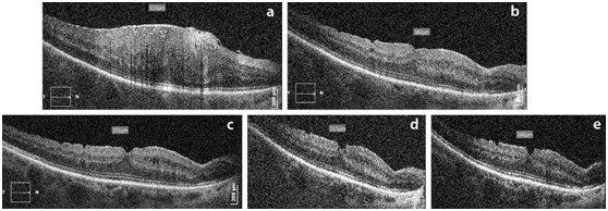 Figure 2 Macular OCT of a 68 years old woman with mild postoperative CMO. (a) preoperative CMT at 610μm. Gradual reduction of the CMT at the postoperative examinations. (b) postop 1m: CMT at 381μm, (c) postop 6m: CMT at 331μm, (d) postop 1yr: CMT at 317μm, (e) postop 3 yrs: CMT at 288μm.