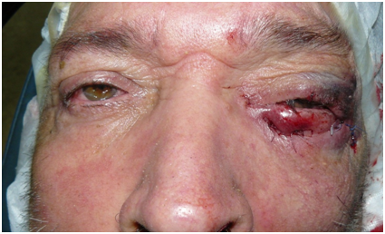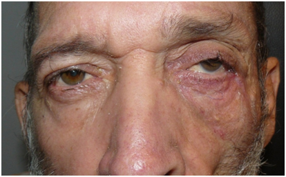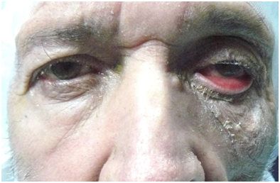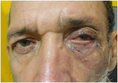A 53 year-old man presented to our clinic with a constant left lower lid tarsal ectropion with severely injected, hypertrophied conjunctiva and epiphora. He gave history of schizophrenia and periocular dermatitis. Corrected visual acuity was 20/20 in both eyes. External examination revealed left upper eyelid ptosis, periocular dermatitis and blepharitis. There was no significant horizontal laxitud of lower lid, as well as of the lateral canthal tendon and no evidence of anterior lamella cicatrisation. The everted tarsus was marked edema and inflammation of the lower tarsal conjunctiva (Figure 1). There was no evidence of lid ulcers, horizontal lid laxity and enophthalmos. Bells phenomenon and ocular motility was normal. The patient underwent a left lower lid correction by three tarsoconjunctival spindles without lateral tarsal strip.