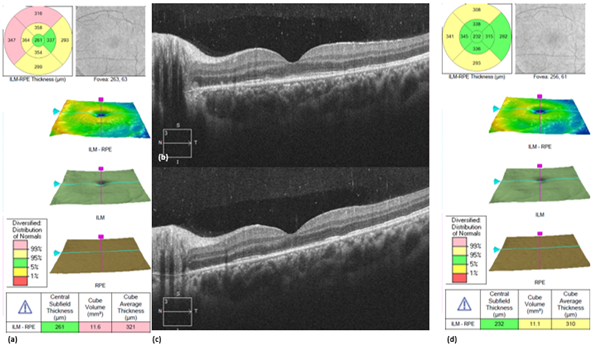 Figure 2 Macular OCT: Image a and b pretreatment and c and d posttreatment. (a) Generalized increase in thickness and macular cube. (b) Presence of vitreous opacities, MER Govetto 1, interruption of ellipsoids and EML, presence of subretinal hyperreflective material. (c) Decrease in thickness, central and in the normal 3 mm area. (d) Reduction of vitreous opacities, hyperreflective material and interruption zones of external hyperreflective lines.