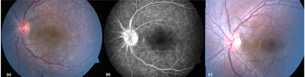 Figure 3 Fluorescein angiography: (a) Pretreatment color photo shows diffuse optic disc edges and multiple grayish-white lesions distributed in the posterior pole. (b) Upon passage of the contrast medium, peridiscal leakage and multiple scattered hyperfluorescent lesions are observed. (c) post-treatment color photo without the presence of grayish-white lesions.