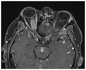 Figure 2 MRI revealed marked diffuse meningitis especially involving the meningeal sheath of the right optic nerve, optic chiasm, and multiple other cranial nerves bilaterally.
