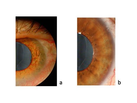 Figure 1 Morphological analysis of the left eye. A) Picture of the anterior segment soon before IVTA; B) Picture of the anterior segment two months after IVTA.