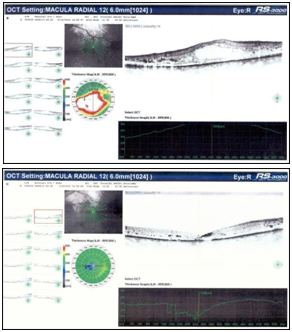 Figure 2 Morphological analysis of the right eye. A) OCT macular thickness soon before IVTA; B) OCT macular thickness 6 months after IVTA.