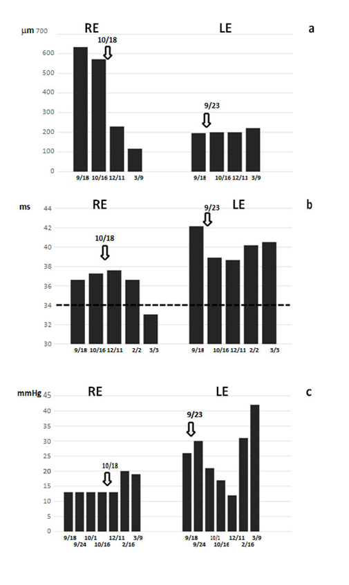 Figure 2 shows the optical coherence tomography (OCT) radial scan of the macula before and after IVTA treatment. Figure 3 shows the trend of macular thickness (a), flicker ERG implicit time (b) and IOP (c). Slit lamp examination of the RE anterior segment revealed moderate lens opacity while in the LE it showed iris and angle NVs, fixed mydriasis, pseudoexfoliation of lens capsule and mild lens opacity. The fundus examination of both eyes showed diabetic retinopathy with hemorrhages, microaneurysms, hard exudates and clinically significant macular edema in the RE with subfoveal and perifoveal hard exudates. Macular thickness measured with the OCT was 634 μm in the RE and 200μm in the LE. Flicker ERG implicit time was 36.64 ms in the RE and 42.15 ms in the LE.