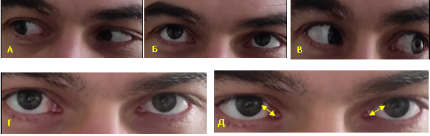 Notes: A. look to the right, Б. initial position, B. look to the left, Г. convergence, Д. nystagmus at close range.