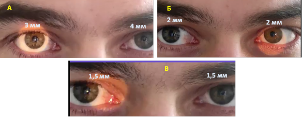 Notes: A. Right site direct pupillary light reaction, Б. Left side swollenness of direct and concomitant light pupillary reactions, but pupillary reactions for close distance were faster, B. Reaction at close range is more active than light.