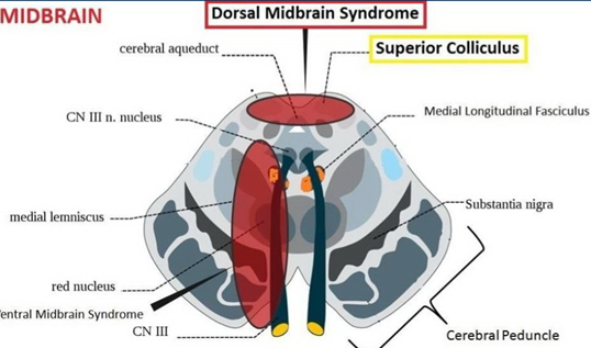 Notes: A - scheme of the midbrain, B – MRI of lesions, 1 - dorsal midbrain syndrome, 2 - ventral midbrain syndrome, arrow – locals of the neurodegeneration.