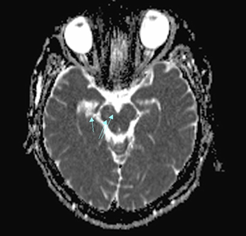 Clinical case 1- Partial Parinaue's syndrome, confirmed by MRI revealed multiple small degenerations in the area of the brain bridge (according to the localization indicated by Parinaue's syndrome - in the dorsal - medial part).