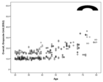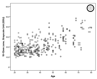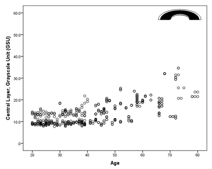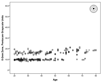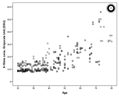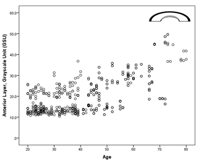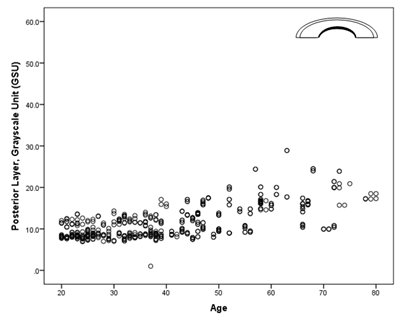 Previously, some literatures2,15 reported significantly increase of corneal density with age and some reported contradictory findings.4,16,17 However, this study observed a significant increase in corneal density of about 2-3 GSU with each increment of a decade of age. It was noted that density adjacent to limbal zone increased at much higher rate than the central zone (0-6mm). This significant increase represented progressive age related changes in cornea such as arcus senilis, vogt’s white limbal gridle, farinata etc. These degenerative but benign conditions are common in elderly and thus not considered as exclusion criteria for the study.18,19
