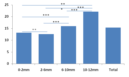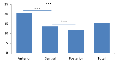 Figure 6 Corneal densitometry Subdivided by Surface Area; **Significant p=0.015; ***Highly Significant p <0.001; p value obtained from independent t test.