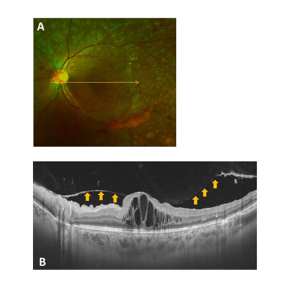 Figure 2 Representative fundus photo and OCT image for a Group 2 (perifoveal PVD) case (A and B). The condition of the posterior wall of the PPVP is indicated by the arrows.