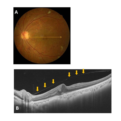 Figure 3 Representative fundus photo and OCT image for a Group 3 (macular PVD) case (A and B). Vitreofoveal separation with persistent attachment to the optic disc is observed. The condition of the posterior wall of the PPVP is indicated by the arrows.