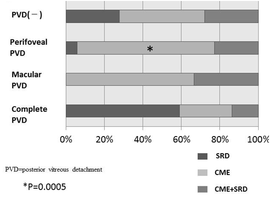 The proportion of serous retinal detachment (SRD) and CME was also determined in each group. When cystic changes in the retina were found within 2mm from the fovea without serous retinal detachment, cases were classified CME group. Because the retinal thickness was increased to an extent in all cases, the morphological investigations in this study focused on only SRD and CME. We excluded all cases associated with vitreous hemorrhage, neovascular glaucoma, epiretinal membrane and proliferative membrane that generated obvious traction to the fovea.