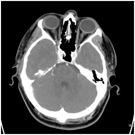 Because branch retinal artery occlusion could not be ruled out, the patient was admitted for the following lab work: complete blood count, Hemoglobin A1C, ANA, lipid panel, RPR/FTA-ABS, HIV, PT/PTT. Imaging was also obtained which included CT (Figure 1) and MRI (Figure 2) as well as echocardiogram of the heart. No imaging abnormalities were found, and there were no abnormal labs besides the positive RPR, including a non-reactive HIV test. When the patient was notified of his positive RPR titer (1:64) with confirmatory FTA-ABS, he returned to the hospital for lumbar puncture which did not reveal any treponemal organisms in his CSF. The patient was initiated on a 14-day course of IV Penicillin, which he completed without complication. The patient’s vision changes have since resolved with no permanent damage noted on funduscopic exam.