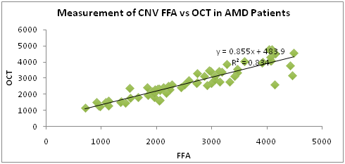 Results: Images of both OCT and FFA for 63 patients were analysed. The relationship between the OCT measurement of the CNV and the FFA leakage was analysed using the regression coefficient. The correlation between the OCT and FFA lesion size was found to have a linear relationship whereby the OCT measurement could be predicted with the equation y=0.8551x+483.94, where y is the OCT lesion size and x is the size of FFA leakage lesion. The coefficient determinant R2 was found to be 0.834.
