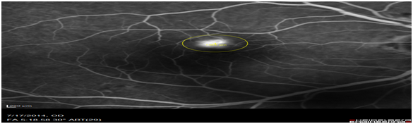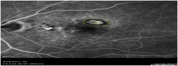 Images of patients (n=63) of patients who had classic type 2 CNV was retrospectively analysed. OCT images obtained on the Heidelberg spectral is at diagnosis were compared to the FFA images obtained on the same day. The OCT biomarker, the sub retinal hyper reflective mass (SRHRM) was used. The same photographer was used to minimise bias. The sub retinal hyper reflective mass was used as the OCT biomarker. The size of this SRHRM was measured at its widest using the caliper setting. This was then compared to the widest diameter of the CNV leakage measured on ultra high-resolution spectral is FFA by drawing a circle around the leage and noting its diameter (Figure 1A,1B & 2A,2B).