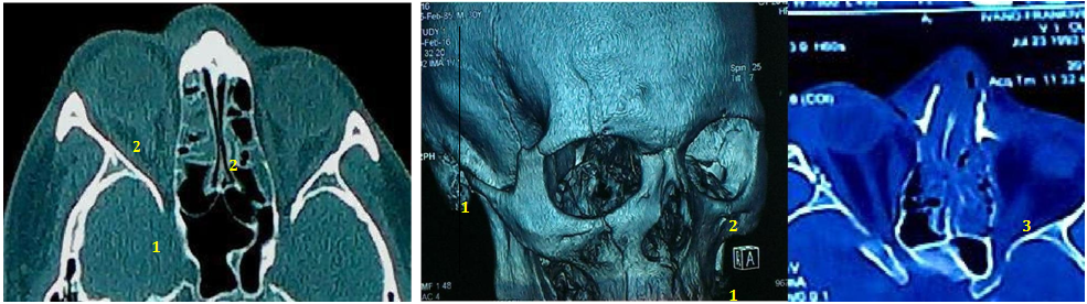 Figure 1 CT scan of right orbit of patient B.: the right orbit dislocation fracture of medial wall (1), right optic nerve compression (2) associated with upper fissure orbit damage (3). Examinations detected ophthalmoplegia, paralytic strabismus, ptosis, violation of convergence. The superior orbital fissure damage and optic nerve compression were diagnosed. Visual acuity on the right side was 0.0 (zero), on the left side was 0.8. The light perception is absence. Direct reaction of the pupil to light on the affected side saved.
