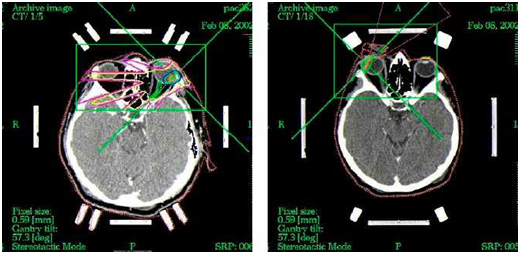 Then the image fusion of CT and MRI contrast is used to calculate the stereotactic treatment planning scheme. The scheme is accordingly optimized against critical structures of the affected eye, such as lens, optic nerve and chiasm (Figure 1). Volume of the tumor influences the calculation of the planned 35.0 Gy therapeutic dose. LSRS is performed on linear accelerator with 6 MeV X. During irradiation at linear accelerator the doses to the critical structures are: less than 8.0 Gy for the optic nerve and the optic disc, and less than 10.0 Gy to the anterior segment of the eye. Just after the LSRS is done the sutures and frame are removed under local anesthesia. Patients after LSRS are followed in three months interval by an ophthalmologist (biomicroscopy, ophthalmoscopy, applanation tonometry, ultrasound, optical coherence tomography) and in six month interval are screened by MRI of the orbit plus metastasis screening (liver ultrasound, liver function test; chest X-ray).