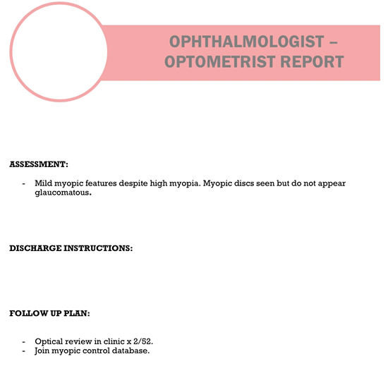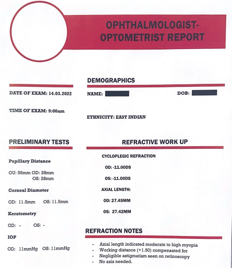 Results: A refractive error of -11.00DS bilaterally was measured. Ocular health assessment showed no significant myopic abnormalities. The patient was dispensed spectacles and adapted well with improved comfort. Low dose atropine myopia control was commenced.
