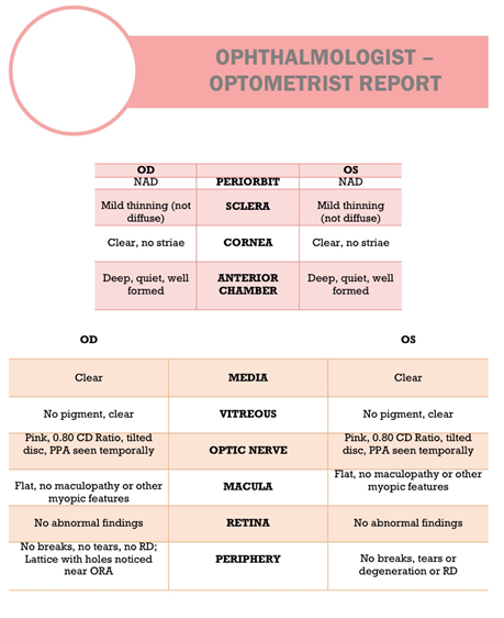 Methods: A paediatric high myope was cyclopleged then underwent objective retinoscopy under general anaesthesia within a surgical theatre setting. Corneal diameter, interpupillary distance, immersion biometry axial lengths, intraocular pressures, keratometry readings, A-scan and B-scan ultrasound images were all subsequently obtained. Lastly, binocular indirect ophthalmoscopic examination with 360º scleral indentation was carried out. A comprehensive O-O report was dispensed with all collated parameters.