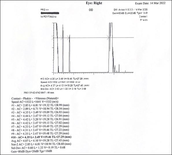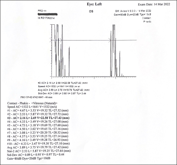 After conducting the refractive portion, tropicamide 1% drops were instilled to maintain maximal dilation of the pupils. The ophthalmologist successively examined both eyes under the operating microscope. The corneal diameter (CD) and interpupillary diameter (IPD) were measured, contact immersion biometry performed, intraocular pressure (IOP) and keratometry measured. A & B-scan ultrasounds scan were then done to assess for axial lengths and posterior staphylomas respectively. Lastly, meticulous binocular indirect ophthalmoscopic examination was done with 360º scleral indentation. A full O-O report was created, as shown in Figures 2A–2C and Figures 3A – 3B with all collated parameters and uploaded to the computerized hospital database. The patient was awakened after the procedure and remained on the post-operative surgical ward for two (2) hours of post-procedural anaesthesiologist monitoring before leaving.
