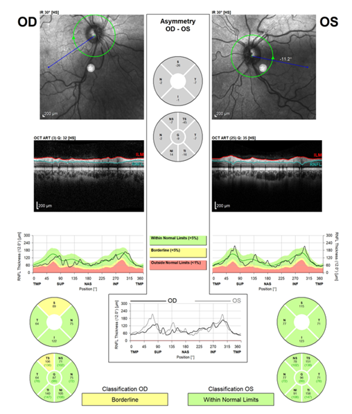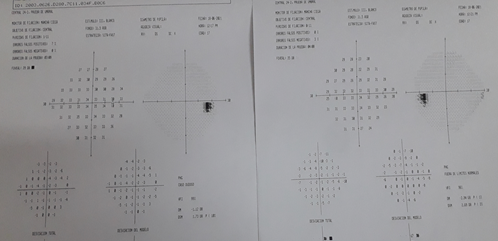 A 24.2 computerized visual field was performed without altered sensitivity in both eyes (Figure 1). An optical coherence tomography of the nerve fiber layer was also performed, which showed a borderline alteration of the upper NFL of the right eye (Figure 2), and a nuclear magnetic resonance where a diffuse thickening of the muscles can be observed. extraocular of both eyes without affectation of the tendon insertions (Figure 3). A basic laboratory was performed (complete blood count, coagulogram, glycemia, urea, creatinine, ionogram, erythrocyte sedimentation rate, PCR) to which was added thyroid profile with TRAB and ATPO antibodies, electrophoretic proteinogram, total antibodies, complete rheumatological profile, IgG4, serologies, radiography. chest and PPD with negative results. Having also ruled out possible myasthenia gravis. The only positive result was an IgE in values that oscillated in each control at 1600 U/ml, remaining high in each laboratory control (Figure 4 & 5).