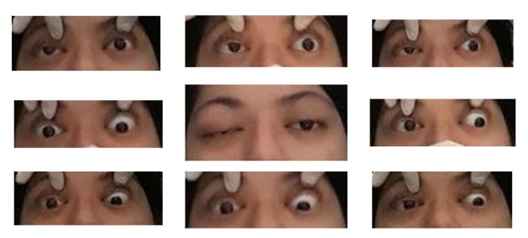 An 18-year-old female patient who attended the clinic due to an acute picture of binocular diplopia with exophthalmos, restricted eye movements and ocular hypertension in both eyes with ptosis of both eyes although more marked in the right eye (Figure 2). At the time of consultation, he did not report any systemic clinical history of interest. A complete ophthalmological examination is performed, in which the aforementioned alterations associated with uncorrected visual acuity 20/20 are evident, both eyes, with normal color test, preserved ocular reflexes. Biomicroscopy showed no particularities, however intraocular pressure measurement was 26 mmHg in the right eye and 25 mmHg in the left eye, with a normal fundus in both eyes.