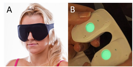 Figure 1 (A) The patient wears the Noctura mask when they go to bed. The mask houses (B) a pod that is activated by touch and then slotted into place in the mask. The gently glowing green OLED lights glow into the eyes through closed lids.