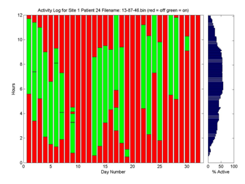 Figure 2 One single month of recording of mask wear to explain the different elements in the recording. The green lines are the nightly periods of mask wear and this patient No24 accumulated 134.15 hours of wear in that month averaging 4.33 hours per night. The patient, in common with many diabetics, appears to have an erratic bedtime schedule. Truncated night time mask wear is seen on days 9, 19 and 30. Also of concern with this patient, however, is the failure to have any mask wear on eight days including on two occasions there are sequences of three days (days 10-12) and two days (days 20 and 21) mask free.