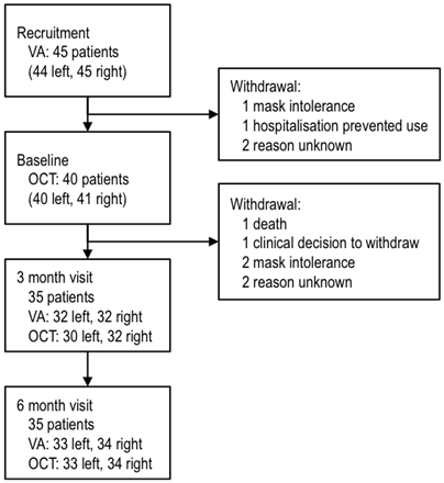Clinical outcome measures were assessed at baseline, at 3+months (half way point) and at 6 months. Medical and ocular history was taken as part of a routine ophthalmic examination. Patients were monitored for treatment-related side effects and complications. Adverse events were recorded, assessed for severity and attribution and reported in line with European Directive 2001/20/EC. At each visit the patient returned their diary and an informal discussion on mask wear issues was undertaken with a health care professional. At the exit visit the patients were asked to fill out a questionnaire that helped direct the safety and tolerance discussion. BCVA was assessed at 4months using Early Treatment Diabetic Retinopathy (ETDRS) boards. In addition retrospective collection of pre-study BCVA was collated from clinical records. The average time these were recorded before the study baseline was 10 months. Spectral domain optical coherence tomography (SD-OCT) (Heidelberg Engineering) was used to determine macular thickness and changes to the vitreoretinal interface. A retinal thickness map centred on the fovea and measurements made of central subfield thickness (CST), cube volume (CV) and cube average thickness (CAT).