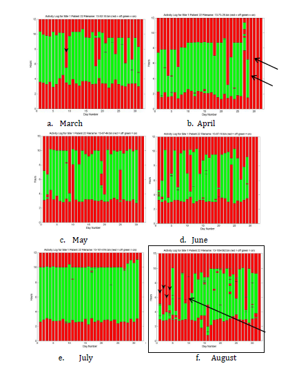 Figure 4 Graphs a to f show the 6 months from March to August respectively of mask use for one patient throughout the trial. The bars in each graph denote the daily operational windows of each month’s mask use. The green indicates when the mask is in operational use and the red when the mask is not in use for each day. The vertical axis shows the time in hours from the commencement of the operational window, 8pm – 8am (local time). Arrows show whole nights missed such as 29th and 30th April and 10th August. Arrow heads show examples of interrupted (truncated) periods of mask to face contact such as the first one on 9th of March and a series from the 1st to 4th of August. Note that July is a consistent and almost perfect month of mask wear for this patient.