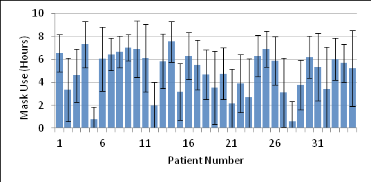 Figure 5 Histogram showing mean nightly mask use (hours) and standard deviations for each completing patient over the full six months of the study. The large variability in usage between patients is evident.