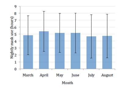 Figure 6 Graph showing mean with standard deviation of nightly mask use (in hours) for the 35 patients who completed the study in each of the months of the study duration.
