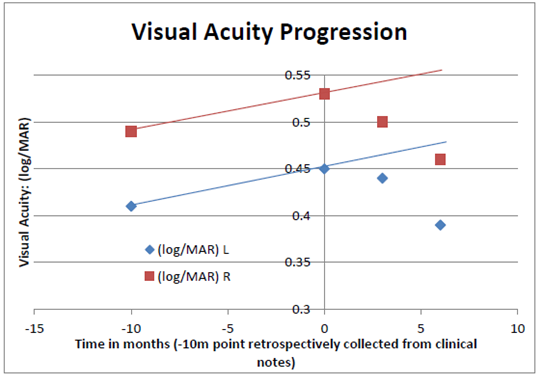Figure 7 A graph showing the average LogMAR VA of the completing patients over the 6 months of the clinical trial for right (red squares) and left (blue diamonds) eyes separately. In addition their VAs prior to trial entry is included (taken on average 10 months prior to trial start point). There was a small visual decline that would reasonably have been expected to continue through the trial period (see prediction lines). However the VA in both eyes progressively improved at the 3 and 6 month time periods.